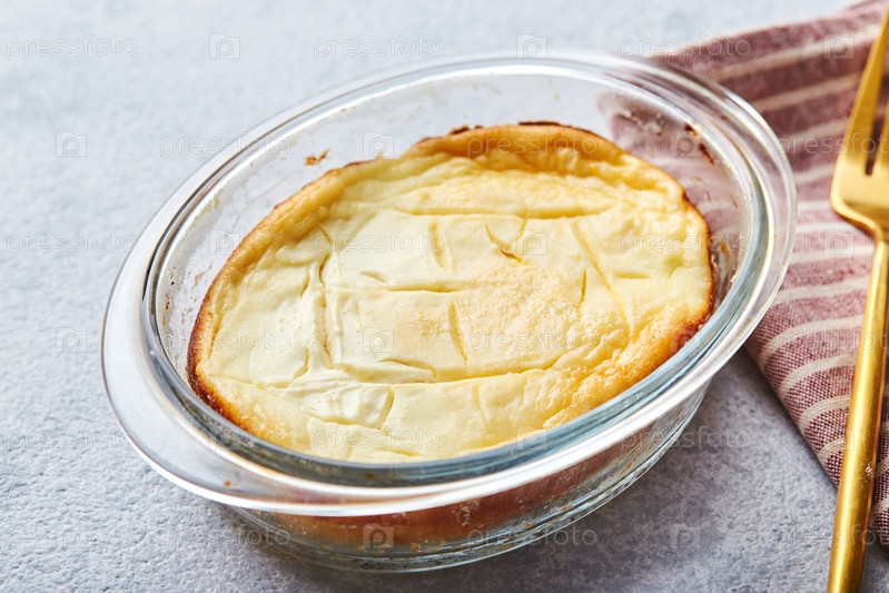 Вкусная творожная запеканка в порционных стеклянных формах со сметаной. Традиционная русская кухня на завтрак - Запеканка