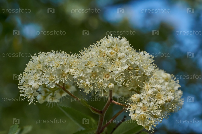 Соцветия рябины (лат. Sorbus) в лучах восходящего весеннего майского солнца