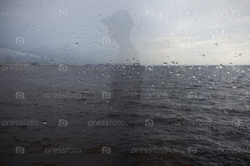 Море в пасмурную погоду, капли на стекле и человеческий силуэт