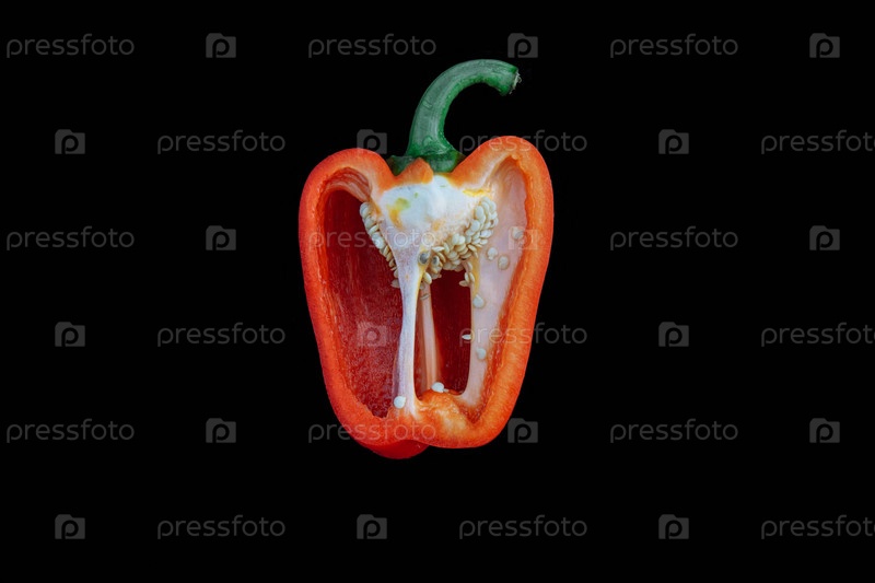Половина красного перца, паприка с семенами и зеленый стебель, выделенные на черном фоне, вид сверху с пустым местом для текста, пространство для копирования, плоская планировка