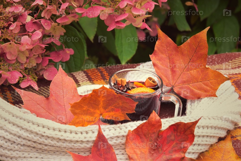 Стакан глинтвейна, завернутый в шарф и осенние кленовые листья на пледе. Селективный акцент на глинтвейн