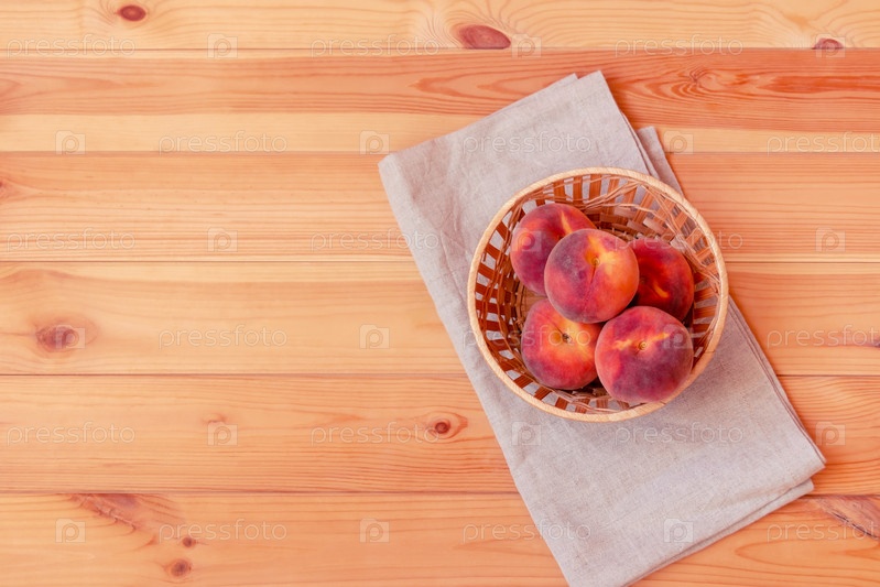 Спелые персики в корзине на деревянном столе