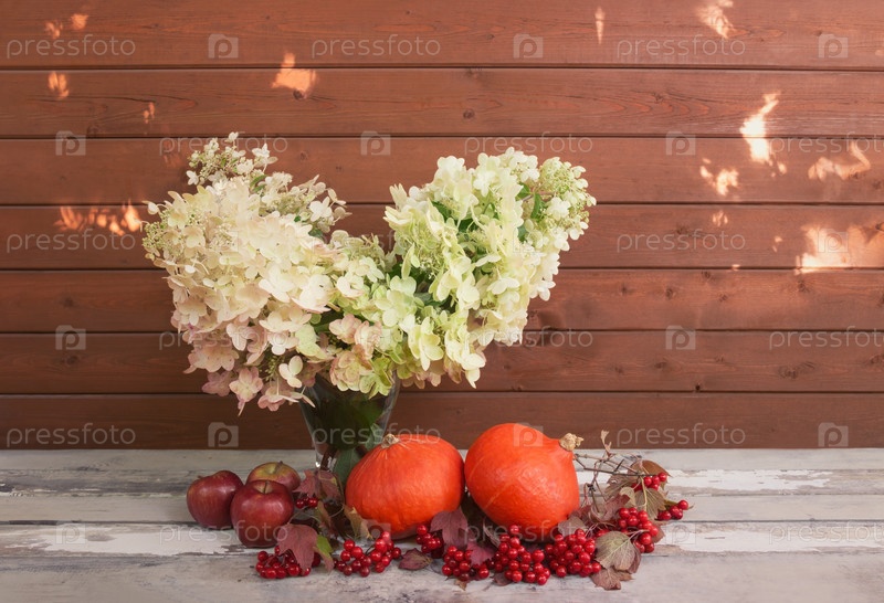 Гортензия, яблоки, ягоды калины и тыквы на деревенском деревянном столе. Солнечные блики на стене позади