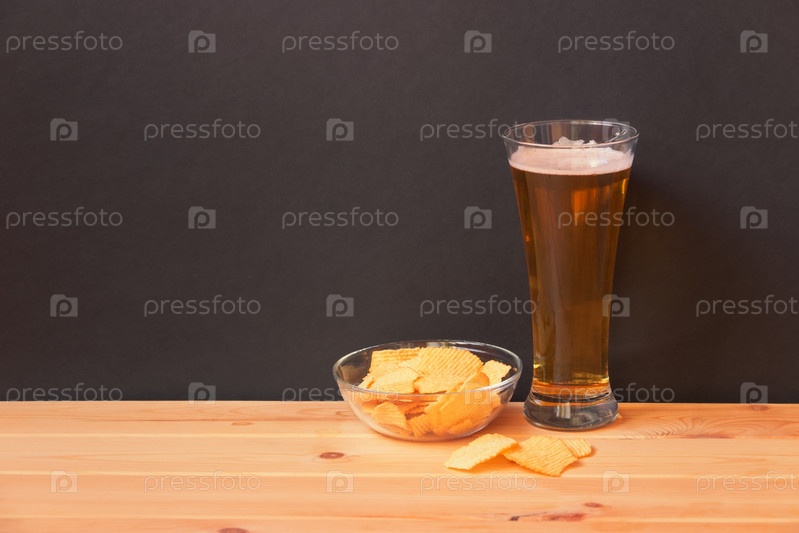 Стакан светлого пива и картофельные чипсы на деревянном столе. Просмотр с копией пространства