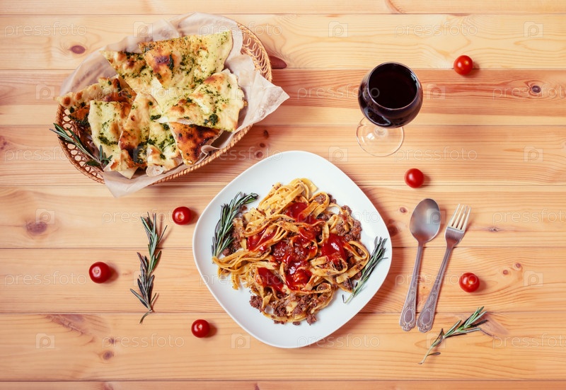 Паста феттучини болоньезе с томатным соусом, бокалом красного вина и хлебом фокачча