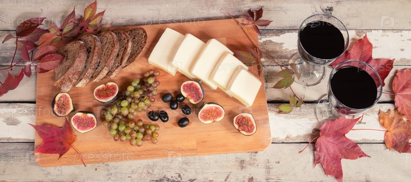 Два бокала красного вина, инжир, сыр, виноград, хлеб, маслины и осенние листья на состаренном деревянном столе. Вид сверху