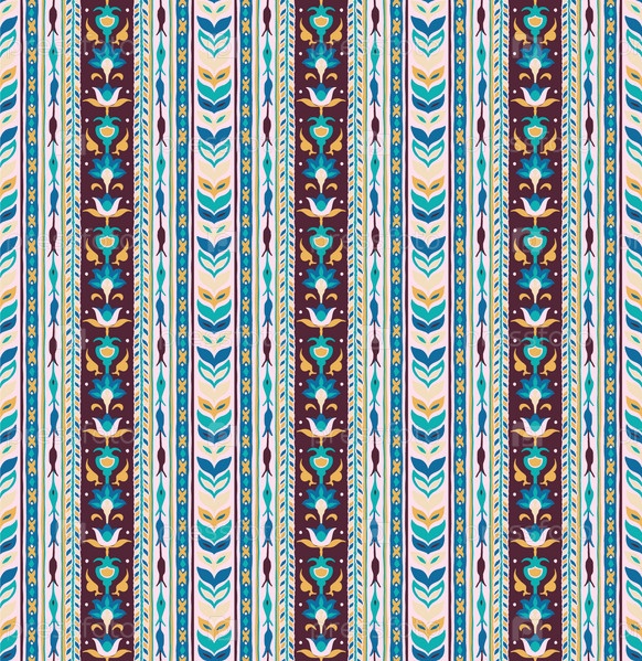 Геометрический дамасский орнамент. Икат границы. Этническая вышивка с листьями и монограммами. Племенная векторная текстура. Бесшовный народный узор в ацтекском стиле. Индийский, скандинавский, цыганский, мексиканский, африканский ковер