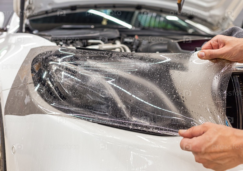 Процесс установки защитной полиуретановой пленки под покраску на переднюю фару автомобиля. Крупный план установки защитной пленки на фару современного роскошного автомобиля