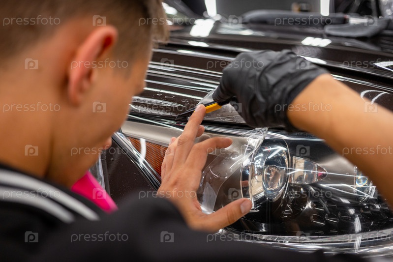 Процесс установки защитной полиуретановой пленки под покраску на переднюю фару автомобиля. Крупный план установки защитной пленки на фару современного роскошного автомобиля
