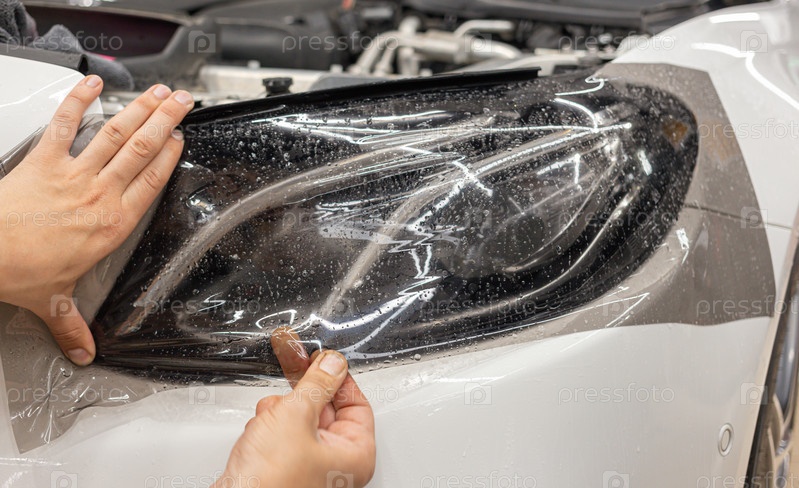 Процесс установки защитной полиуретановой пленки под покраску на переднюю фару автомобиля. Крупный план установки защитной пленки на фару современного роскошного автомобиля