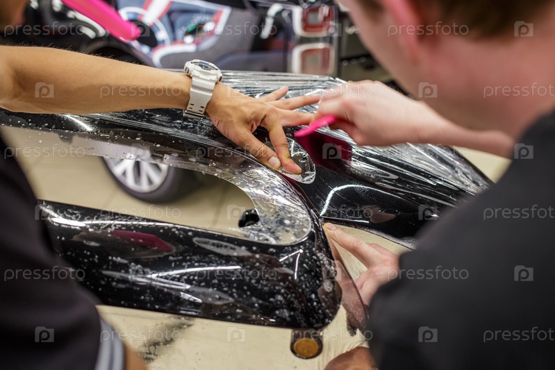 Крупный план установки защитной пленки на передний бампер современного роскошного автомобиля. Защита от гравитации. ПФФ установлен. Обертывание автомобиля крупным планом