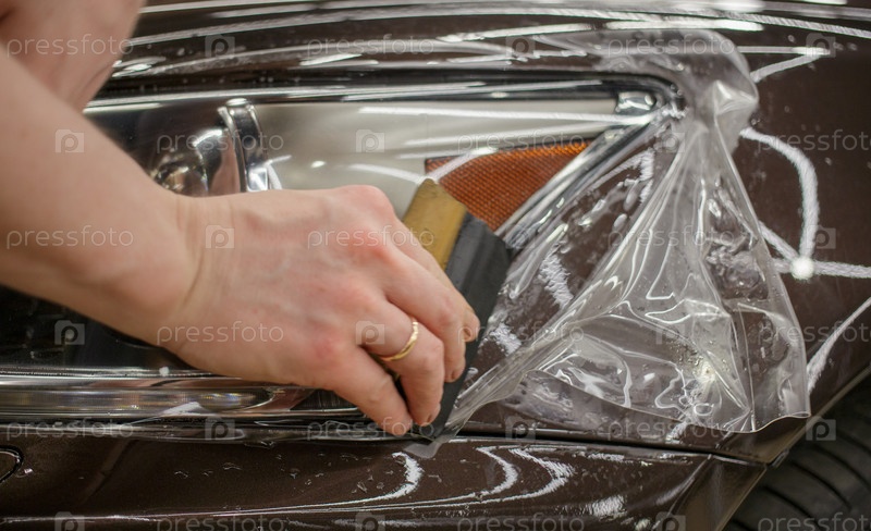 Процесс установки защитной полиуретановой пленки под покраску на переднюю фару автомобиля. Крупный план установки защитной пленки на фару современного роскошного автомобиля