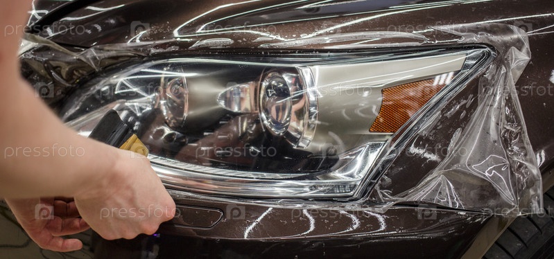 Процесс установки защитной полиуретановой пленки под покраску на переднюю фару автомобиля. Крупный план установки защитной пленки на фару современного роскошного автомобиля
