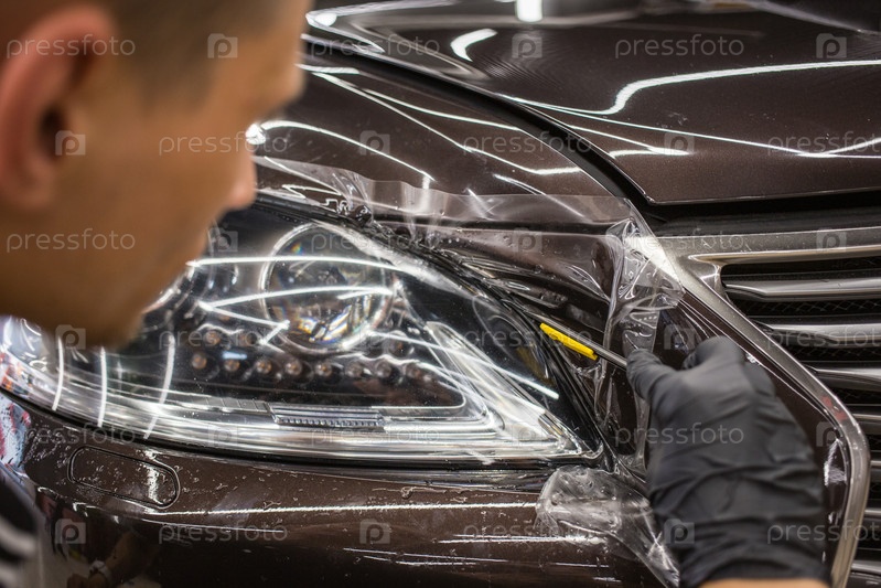 Процесс установки защитной полиуретановой пленки под покраску на переднюю фару автомобиля. Крупный план установки защитной пленки на фару современного роскошного автомобиля