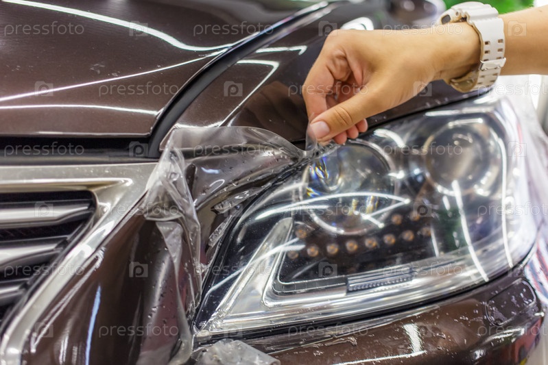 Процесс установки защитной полиуретановой пленки под покраску на переднюю фару автомобиля. Крупный план установки защитной пленки на фару современного роскошного автомобиля