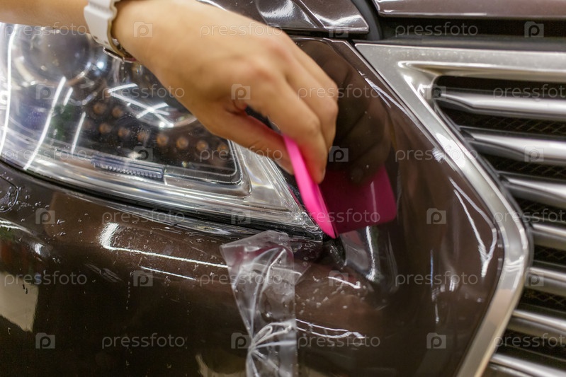 Процесс установки защитной полиуретановой пленки под покраску на переднюю фару автомобиля. Крупный план установки защитной пленки на фару современного роскошного автомобиля