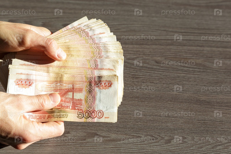 Мужчина держит веер из банкнот номиналом 5000 рублей крупным планом
