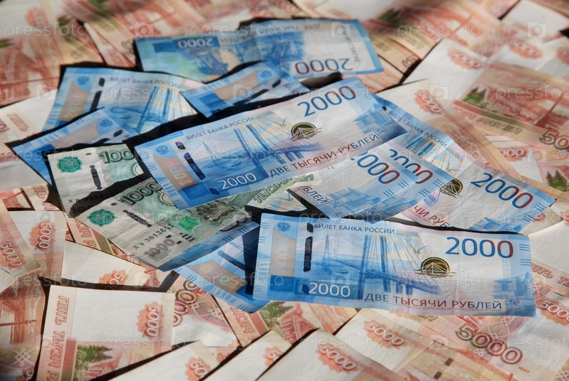 Российские деньги. Крупный план российских рублей. Разный номинал купюр. Концепция финансов. Фон и текстура денег. Копировать пространство