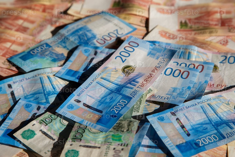 Российские деньги. Крупный план российских рублей. Разный номинал купюр. Концепция финансов. Фон и текстура денег. Копировать пространство