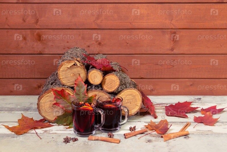 Куча дров, стаканы глинтвейна и красочные осенние кленовые листья. Выборочный фокус. Просмотр с копией пространства