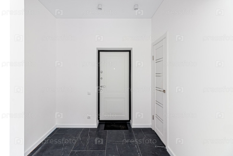 Пустая отремонтированная комната в светлых тонах с черной дверью. Входная дверь в дом