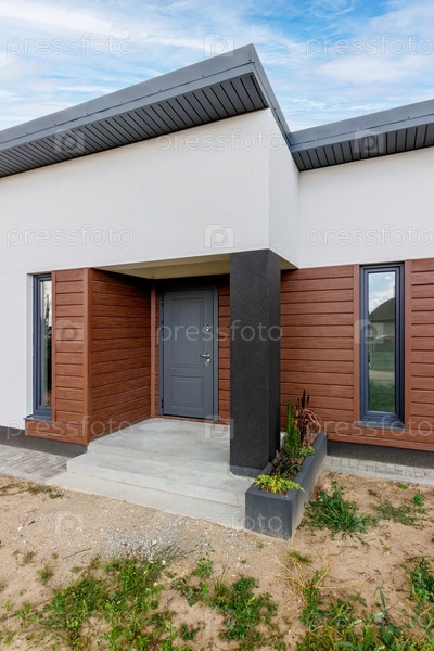 Вид небольшого современного дома сразу после постройки. Ступенчатая система строительства дома