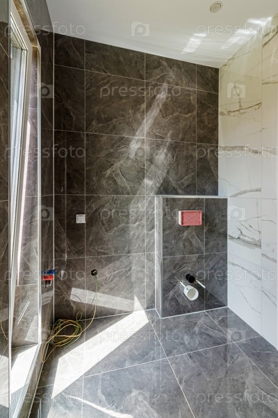 Ванная комната со стенами, выложенными плиткой до установки душа и раковины, находится в строящейся квартире