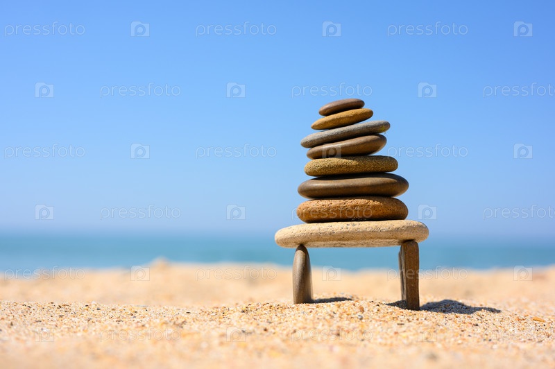На берегу моря на двух тонких камнях стоит галечная башня. Равновесная фигура морской гальки на фоне моря