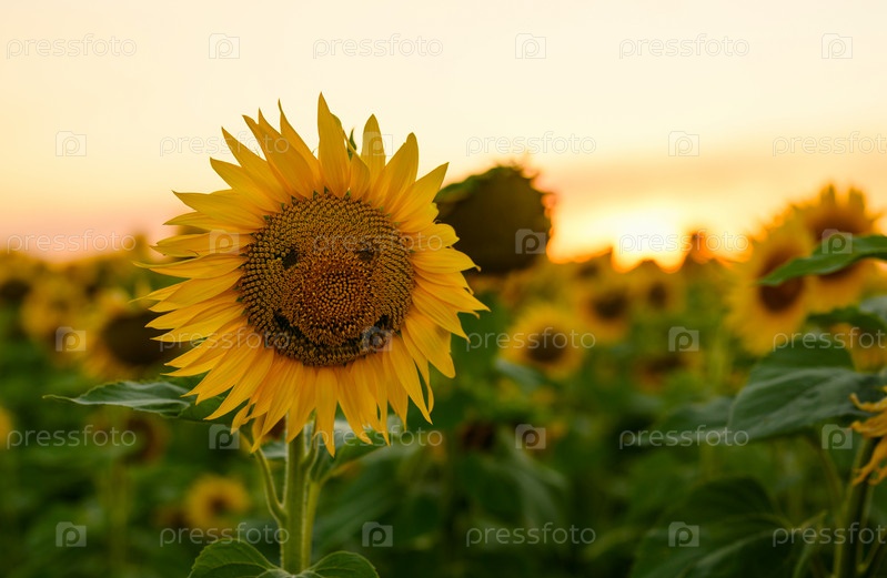 Веселый подсолнух на закате. Спелый подсолнух с глазами и улыбкой. Селективный фокус на подсолнухе