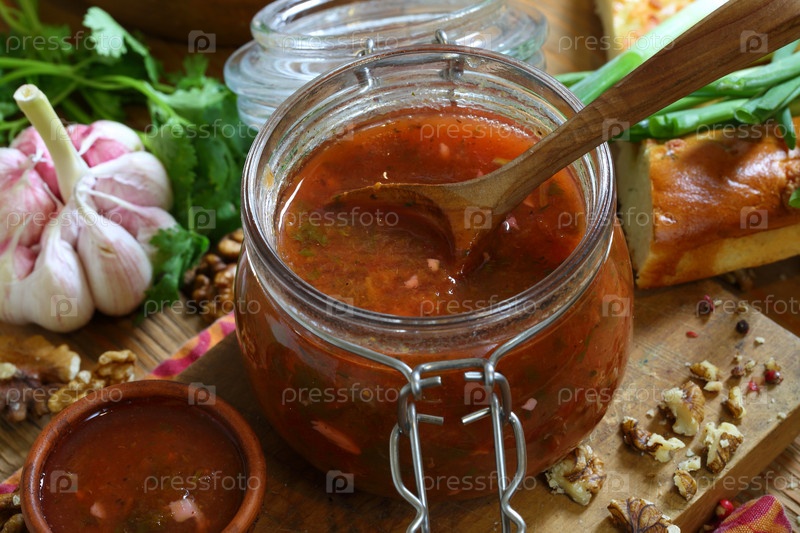 Грузинский соус ткемали на деревянном столе