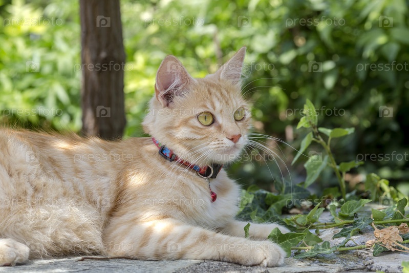 Рыжая домашняя кошка на прогулке