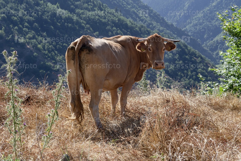 Корова пасется на горном лугу