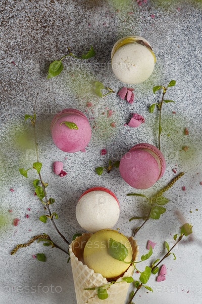Десерт макарунсы в вафельном стаканчике на столе