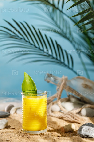 Тропический коктейль на фоне берега моря и рядом бутылка с посланием