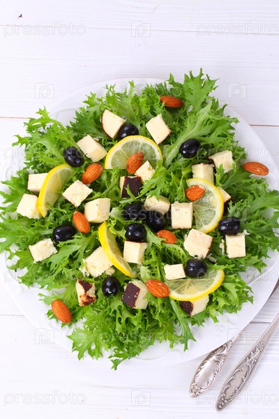 Салат с сыром,лимоном и листьями салата на белом фоне