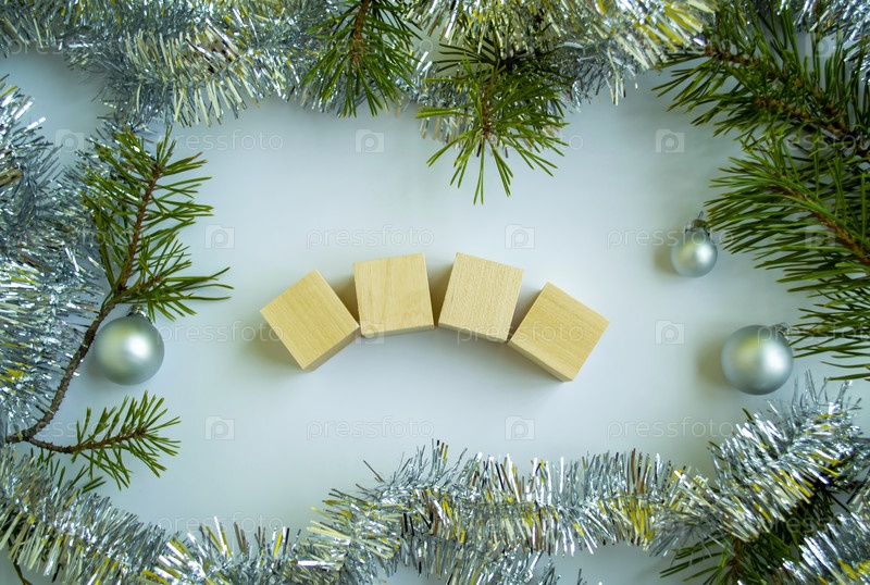 Шаблон новогодней открытки. Деревянные кубики для числа года, еловые ветки, мишура и рождественские шары на белом фоне