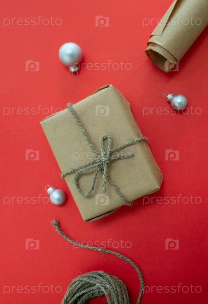 Новогодняя подарочная упаковка, вертикальный фон. Подарок из крафт-бумаги, шпагата, бумаги и новогодних шаров на красном фоне