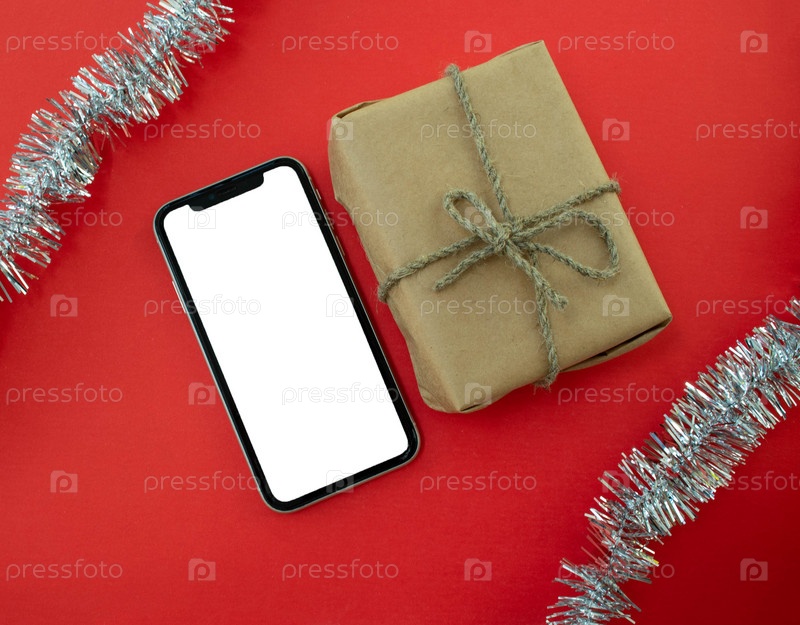 Макет, смартфон, подарок из крафт-бумаги и мишура на красном фоне