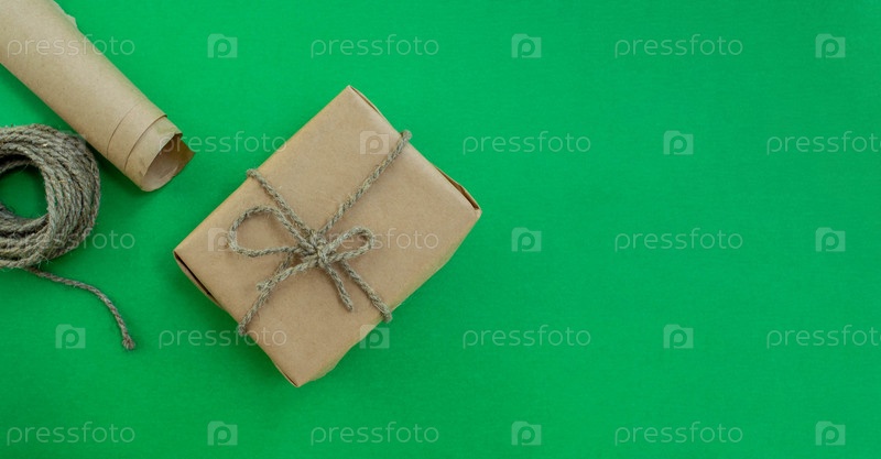 Упаковка рождественского подарка. Подарок из крафт-бумаги, шпагата, бумаги на зеленом фоне