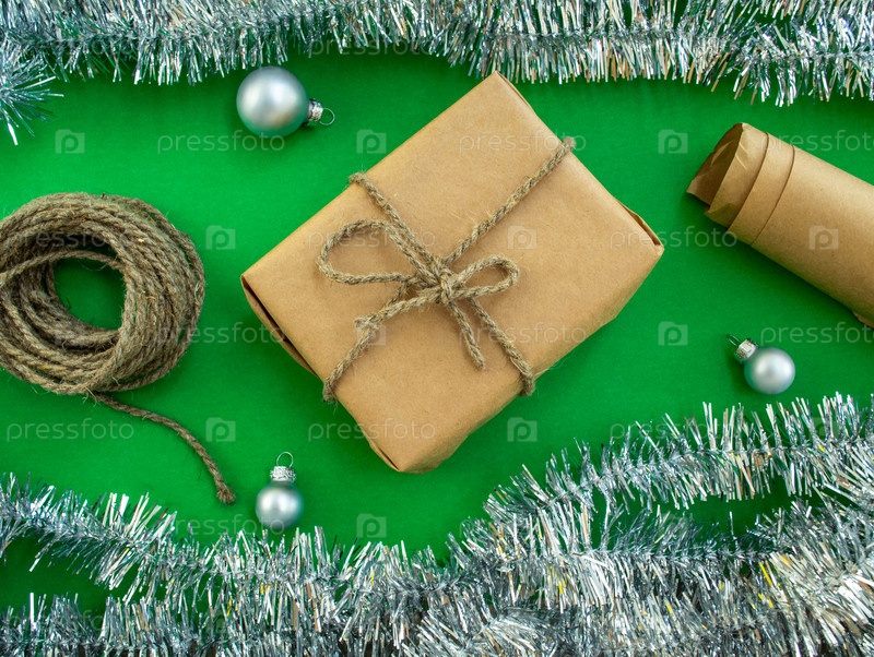 Упаковка рождественского подарка. Подарок из крафт-бумаги, шпагата, бумаги, мишуры и новогодних шаров на зеленом фоне