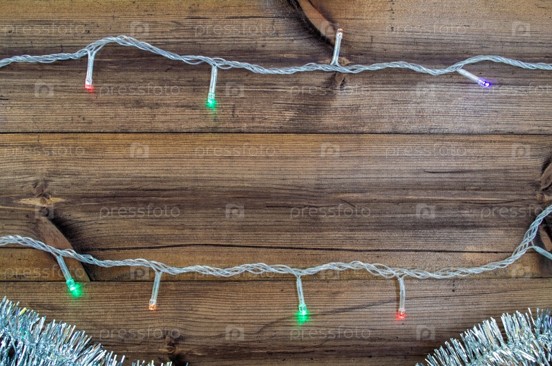 Новогодний фон с копией пространства в центре. Серебряная мишура и гирлянда на деревянном фоне