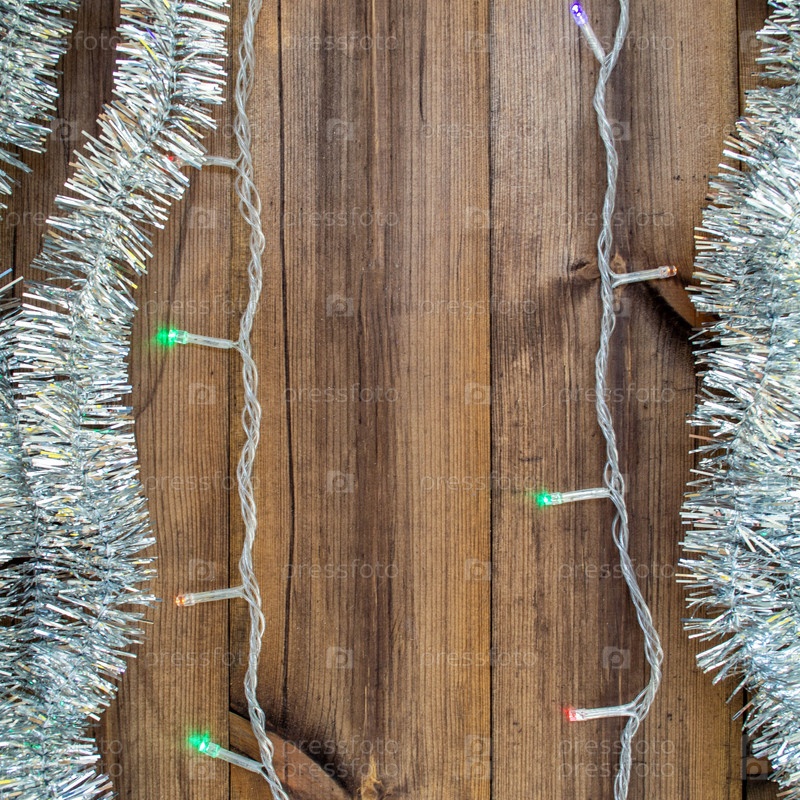 Рождественский квадратный фон с копией пространства в центре. Серебряная мишура и гирлянда на деревянном фоне