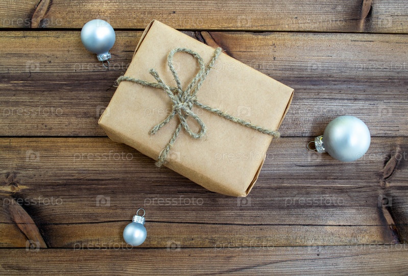 Новогодний подарок. Подарок из крафт-бумаги и новогодних шаров на деревянном фоне