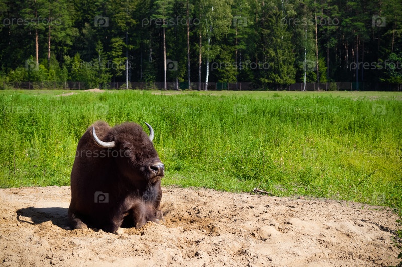Зубробизон, гибрид зубра и бизона, большое рогатое копытное лежит на песке в парке