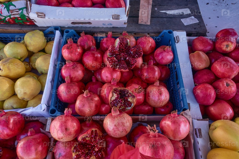 Гранат в коробках на рынке. Свежие яблоки, груши, айва и гранаты продаются в пластиковой таре на оптовом рынке