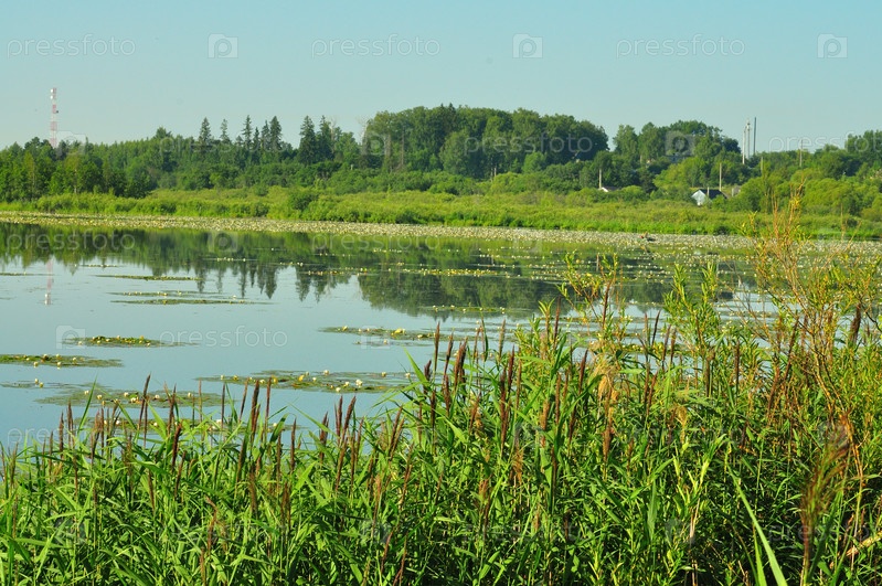Ровная поверхность озера ранним утром заросшая кувшинками