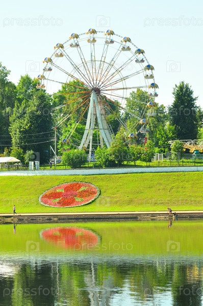 Вид на колесо обозрения в Городском саду со стороны набережной Волги имени Афанасия Никитина
