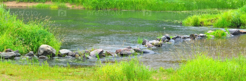 Панорама реки Медведица с запрудой из камней в дождь
