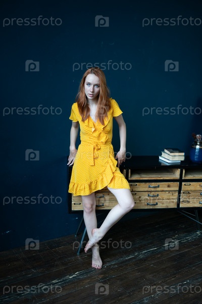 Молодая красивая женщина позирует в желтом платье в студии