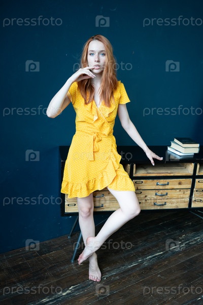 Молодая красивая женщина позирует в желтом платье в студии